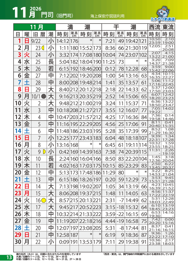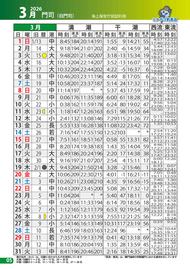 ☆門司以外の各地の潮時は各地潮時差表によって計算してください。例え(蒲江)の潮時を知りたい時は、各地潮時差表をみると時差-1.15となっていますいので、門司の潮時から満干時とも各々1時間15分減算すれば、その時刻表が蒲江の満時となります。